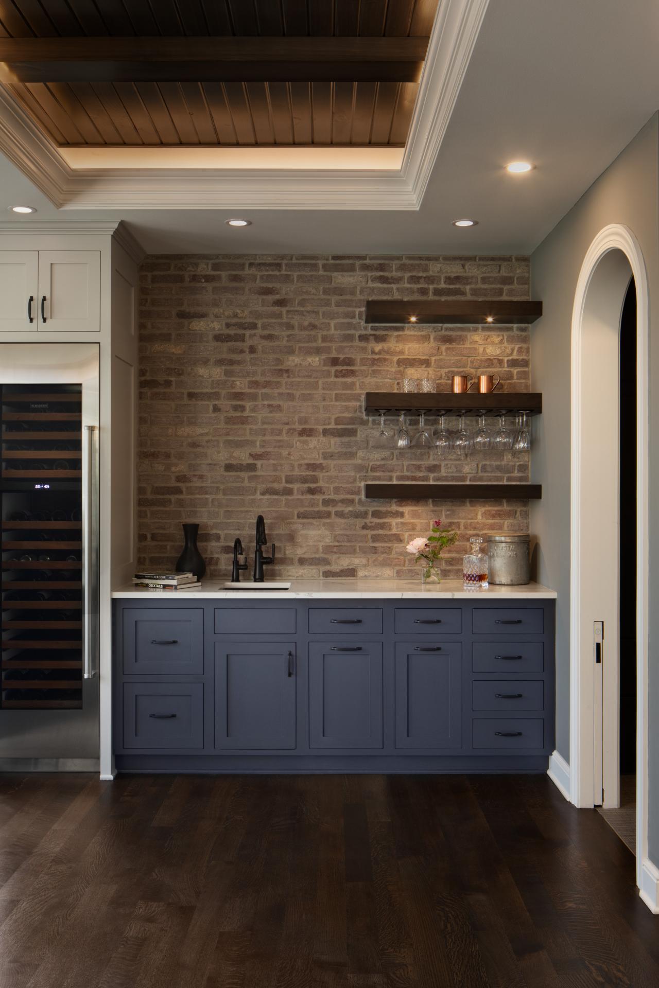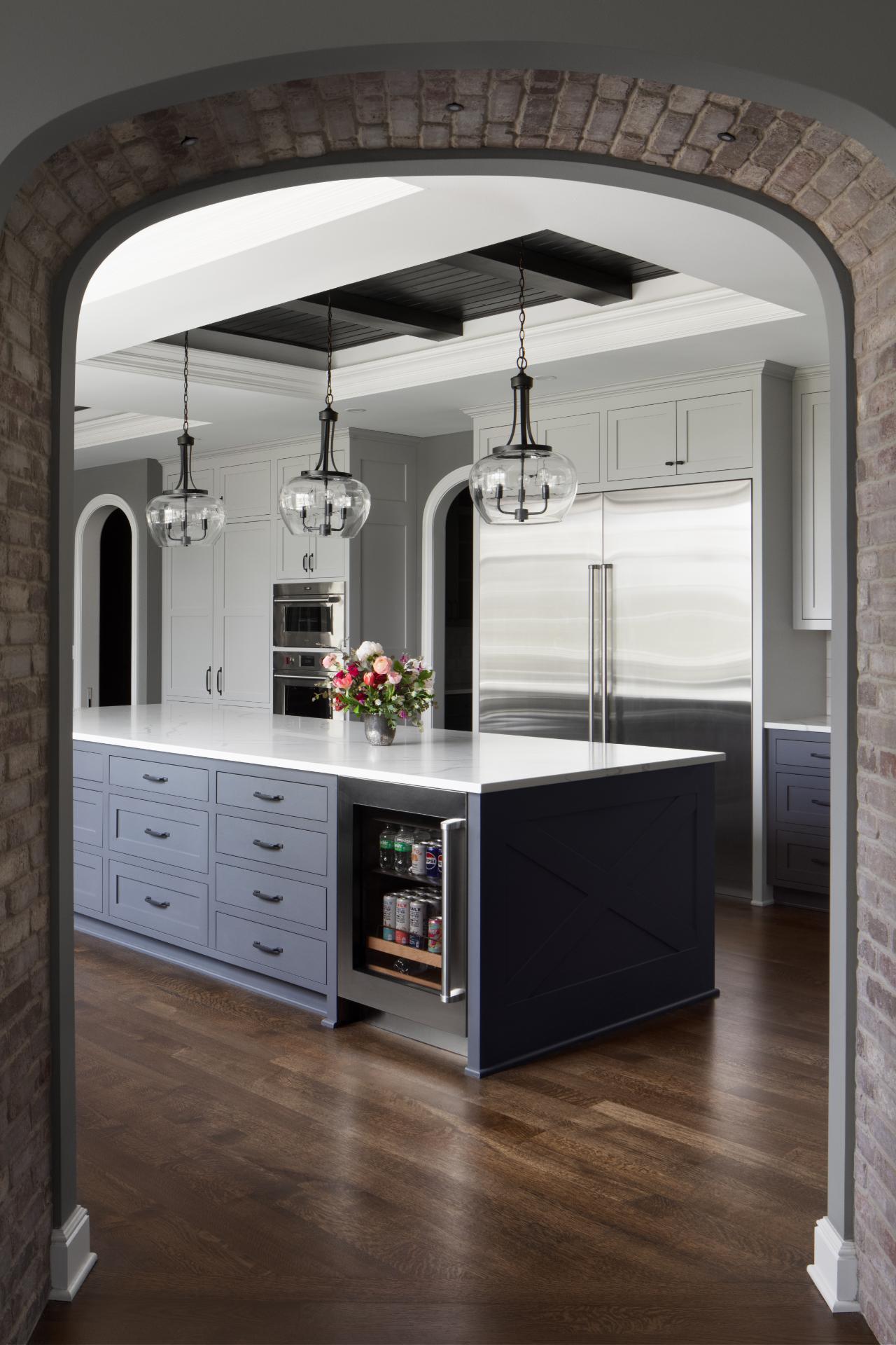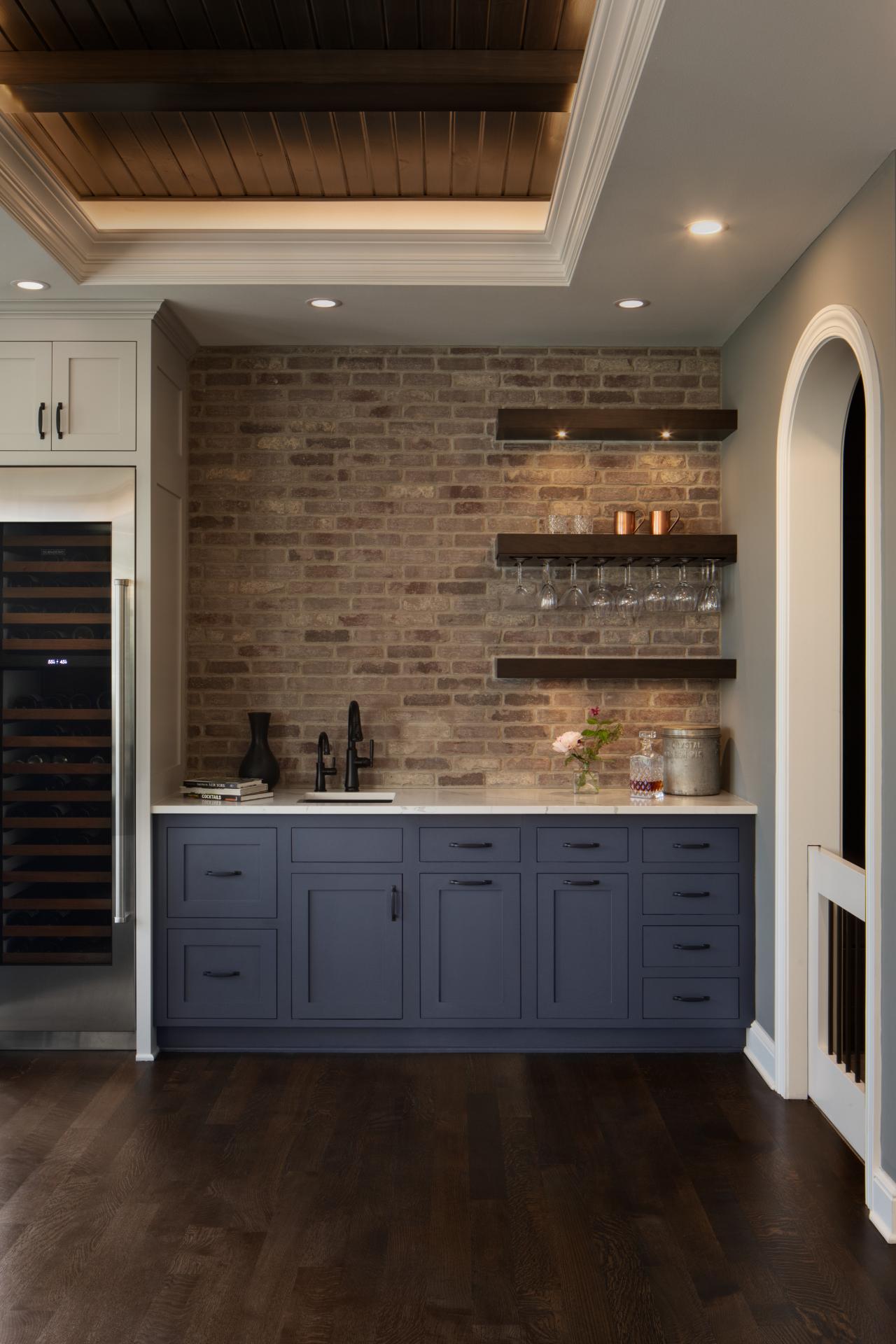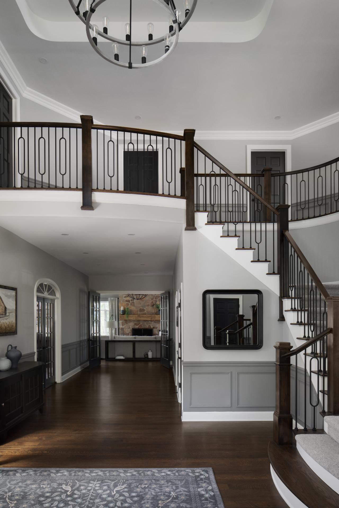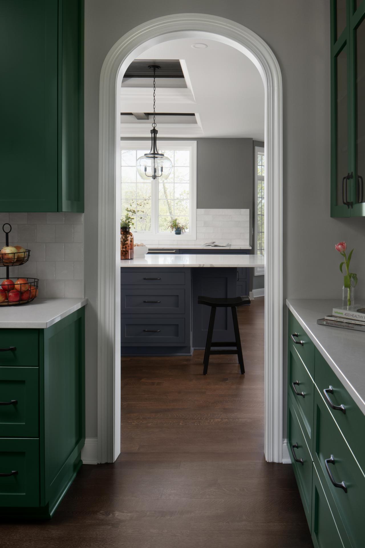 We reworked nearly every inch of this first floor to turn a dated layout into a warm, functional space for family living and entertaining. In the kitchen, coffered ceilings, arched openings, and layered finishes create a sense of timeless character, while natural light and custom cabinetry keep things fresh and inviting. The new mudroom, butler’s pantry, sunroom, powder room, and living room were all thoughtfully updated to feel cohesive yet distinct, with details like brick accents, bold cabinetry, and modern lighting pulling everything together.