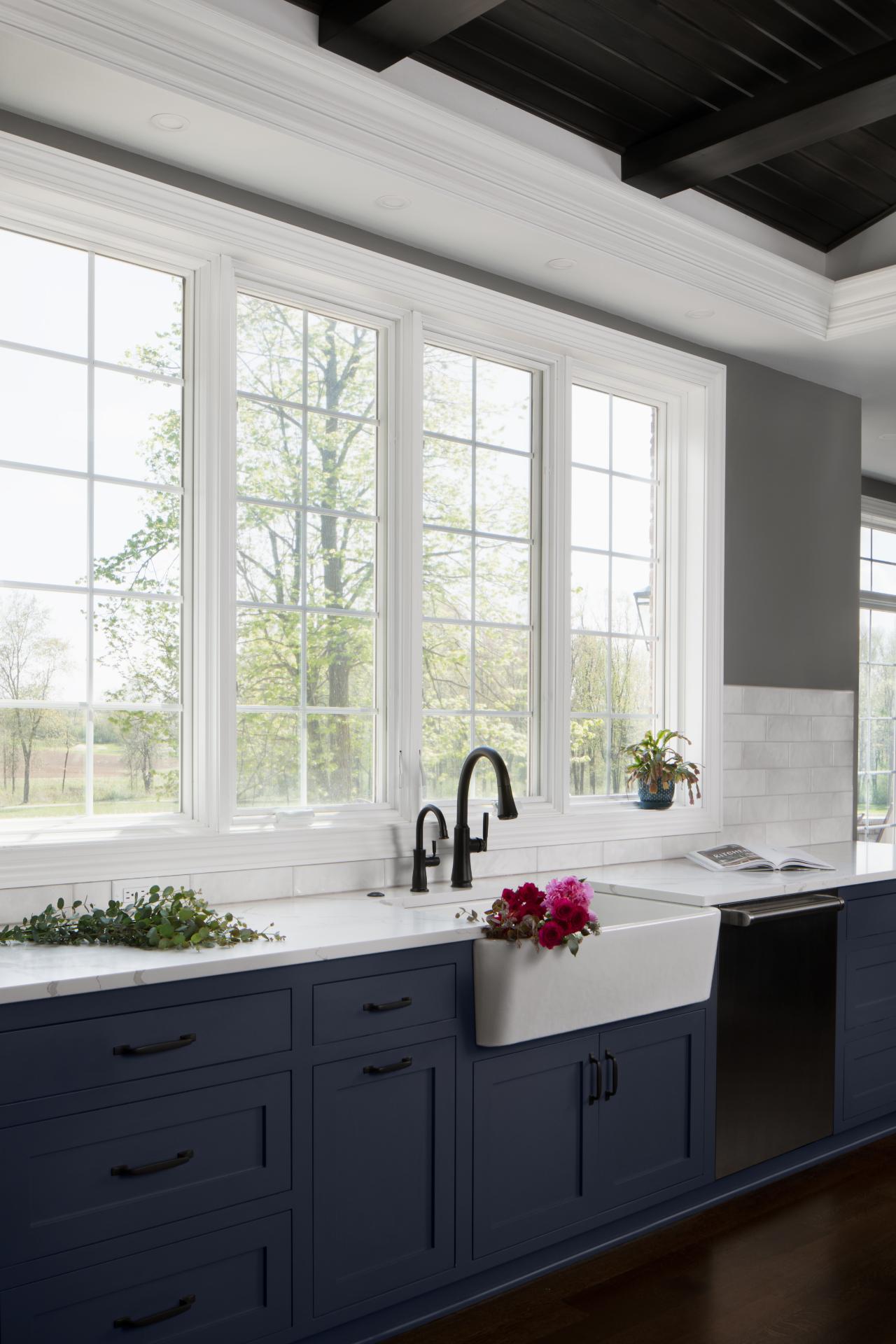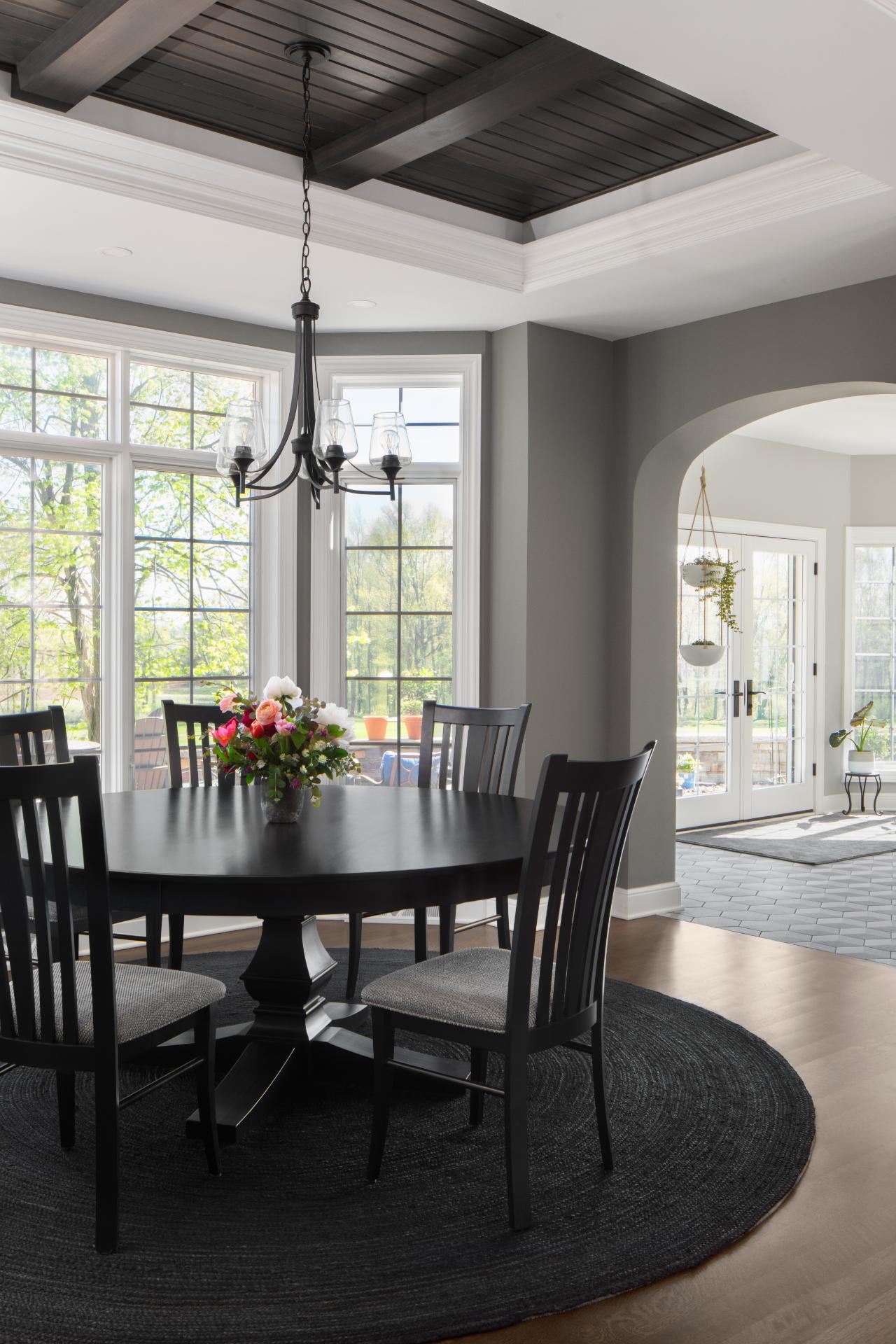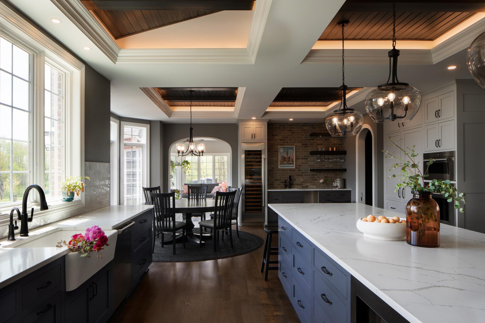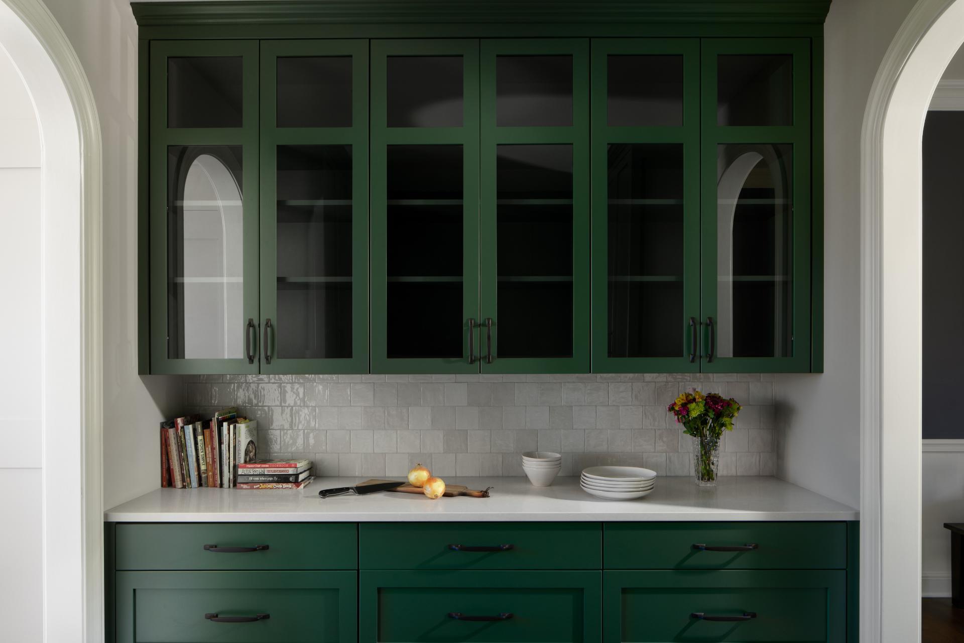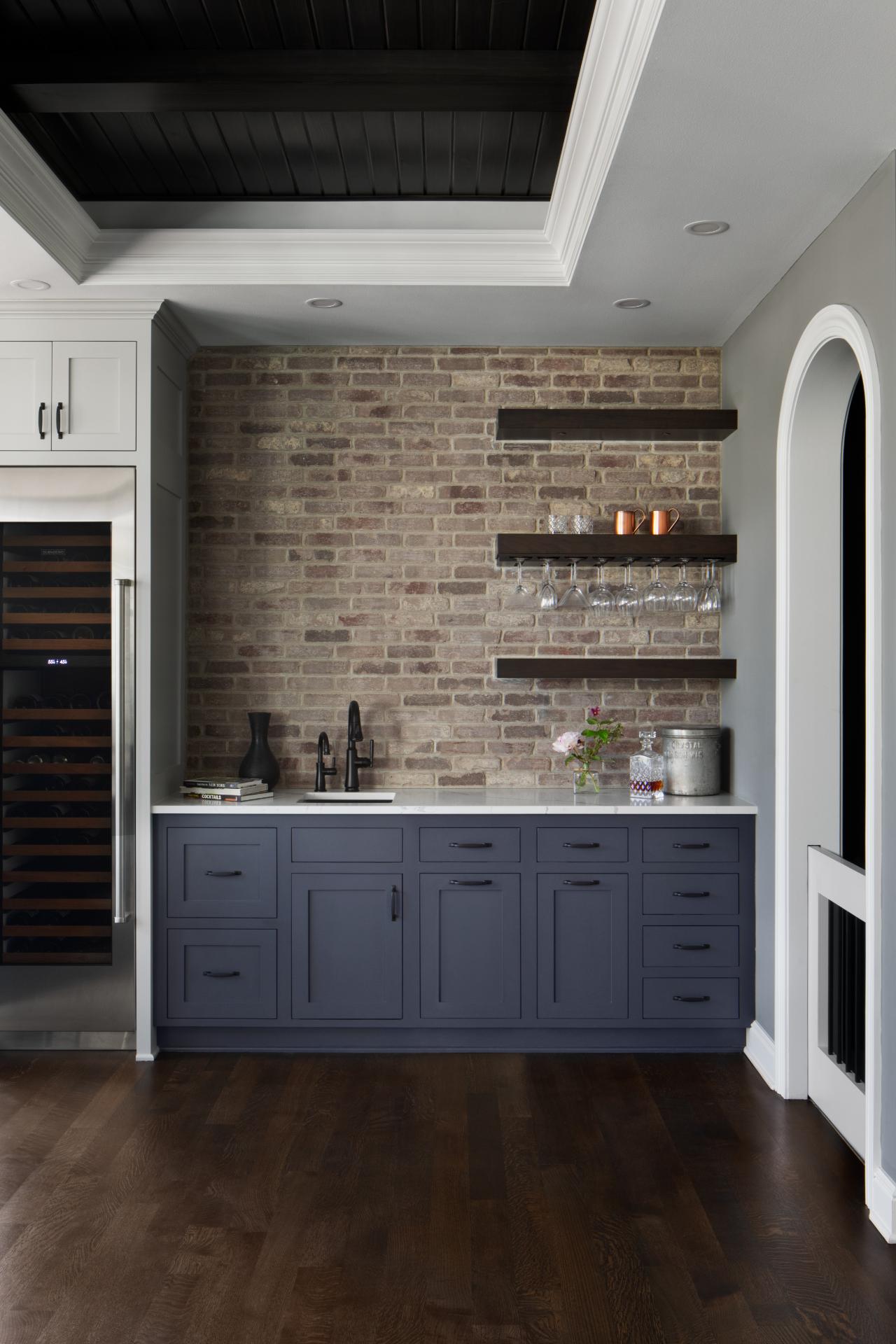 We reworked nearly every inch of this first floor to turn a dated layout into a warm, functional space for family living and entertaining. In the kitchen, coffered ceilings, arched openings, and layered finishes create a sense of timeless character, while natural light and custom cabinetry keep things fresh and inviting. The new mudroom, butler’s pantry, sunroom, powder room, and living room were all thoughtfully updated to feel cohesive yet distinct, with details like brick accents, bold cabinetry, and modern lighting pulling everything together.