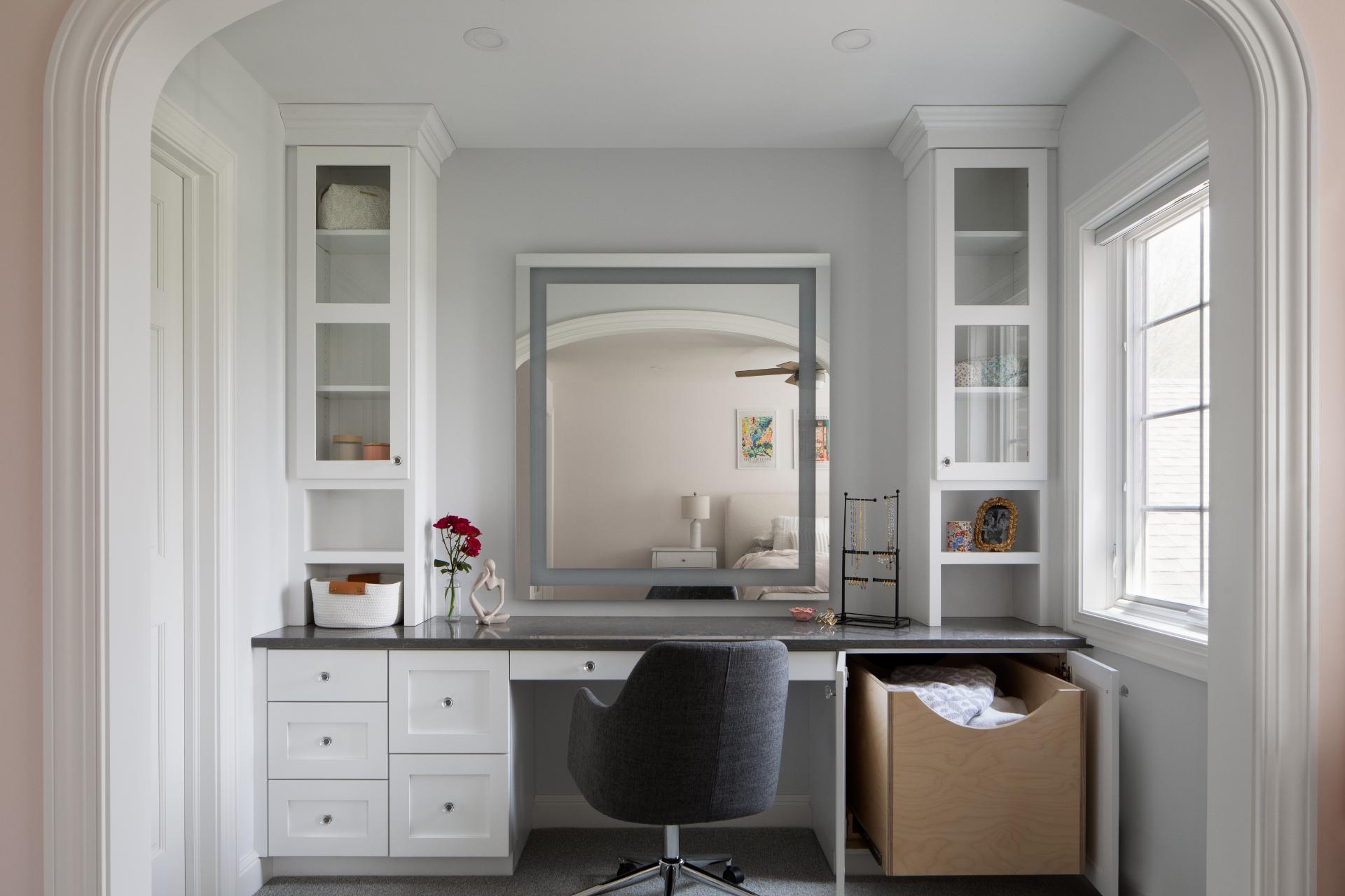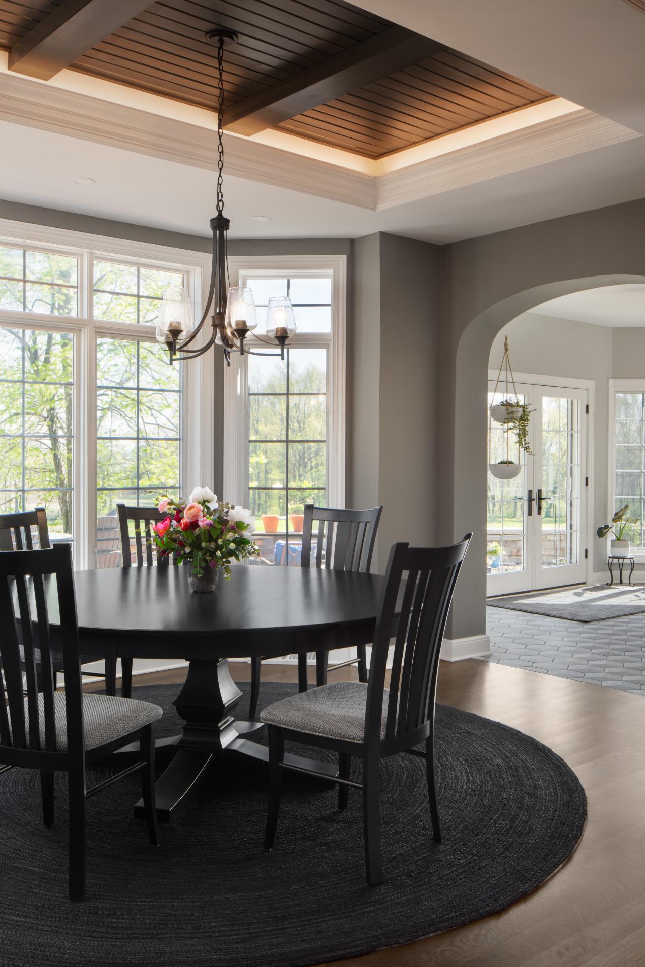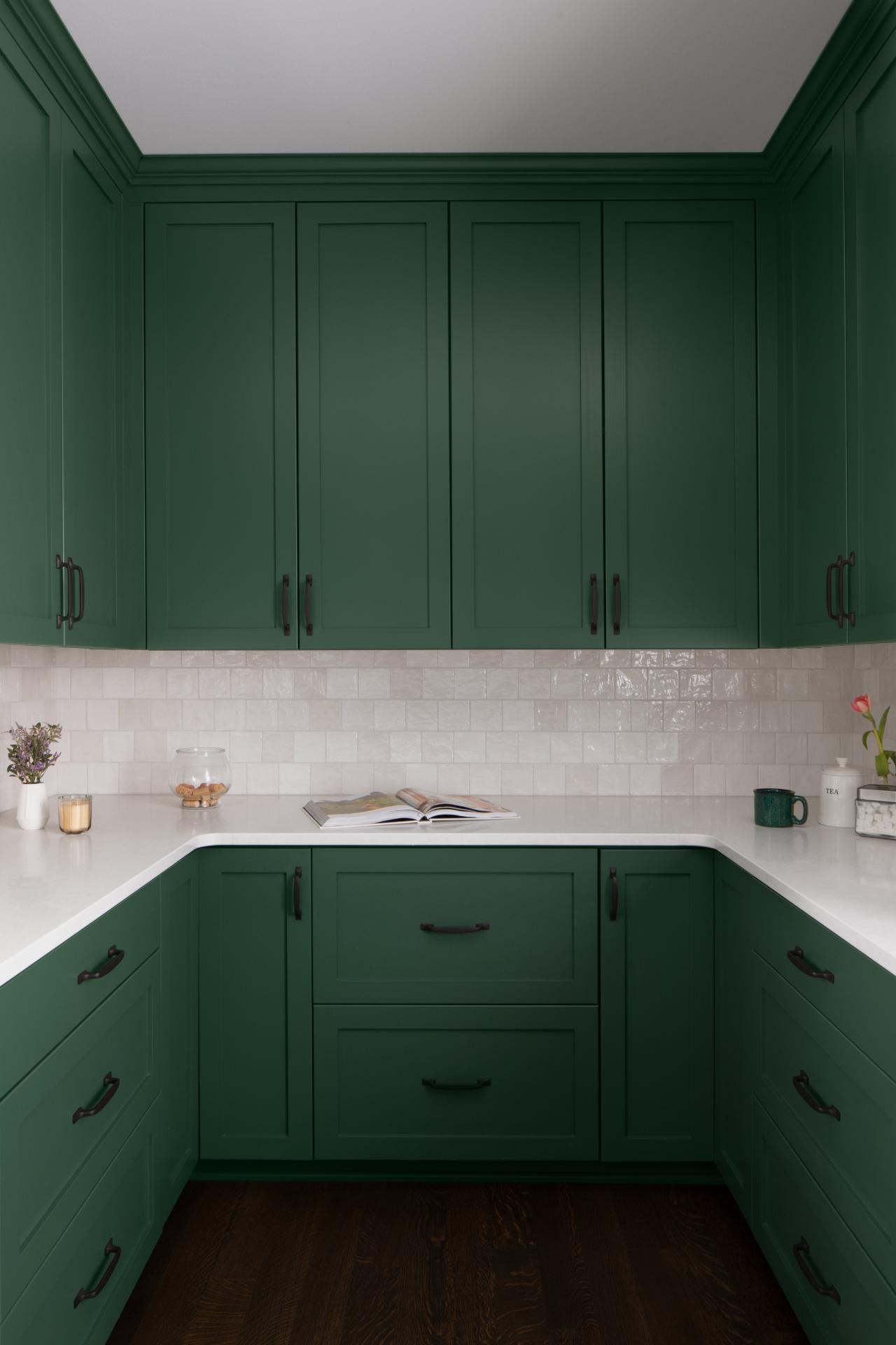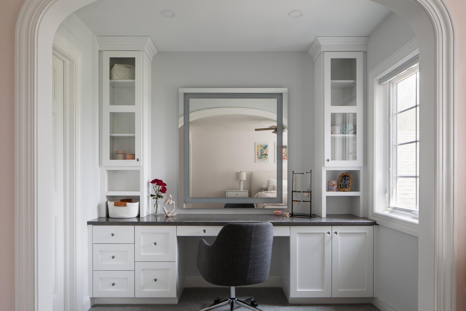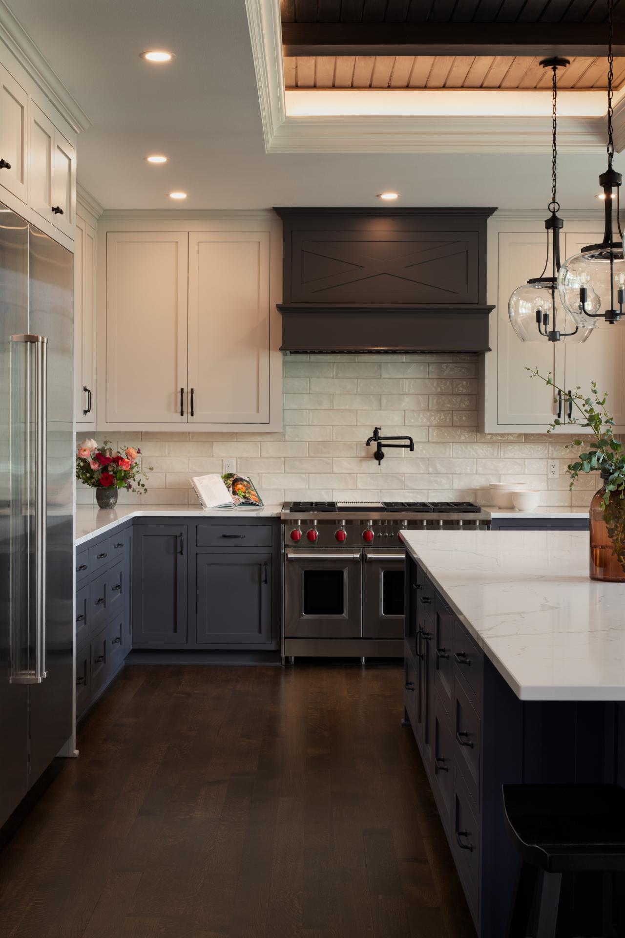 We reworked nearly every inch of this first floor to turn a dated layout into a warm, functional space for family living and entertaining. In the kitchen, coffered ceilings, arched openings, and layered finishes create a sense of timeless character, while natural light and custom cabinetry keep things fresh and inviting. The new mudroom, butler’s pantry, sunroom, powder room, and living room were all thoughtfully updated to feel cohesive yet distinct, with details like brick accents, bold cabinetry, and modern lighting pulling everything together.