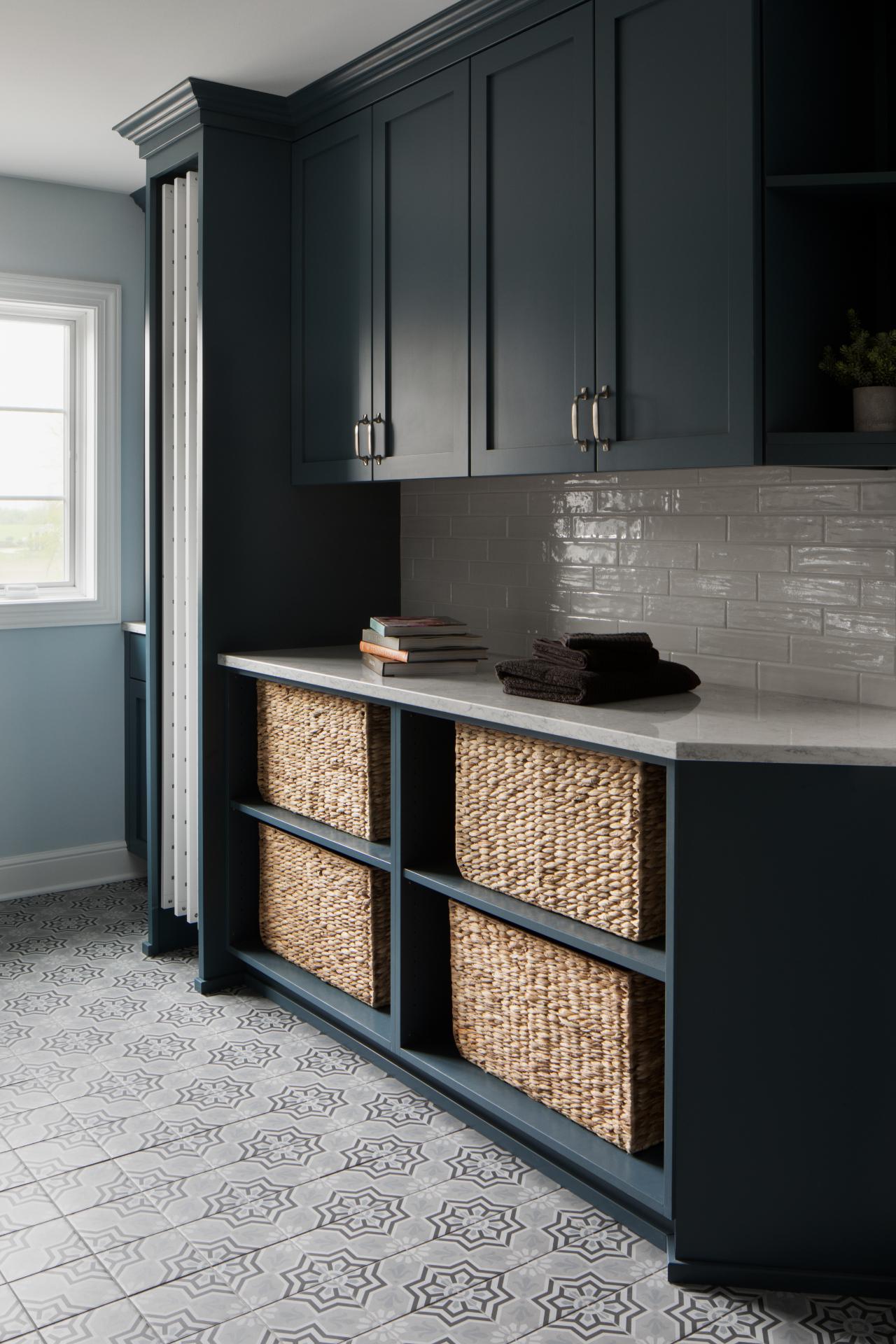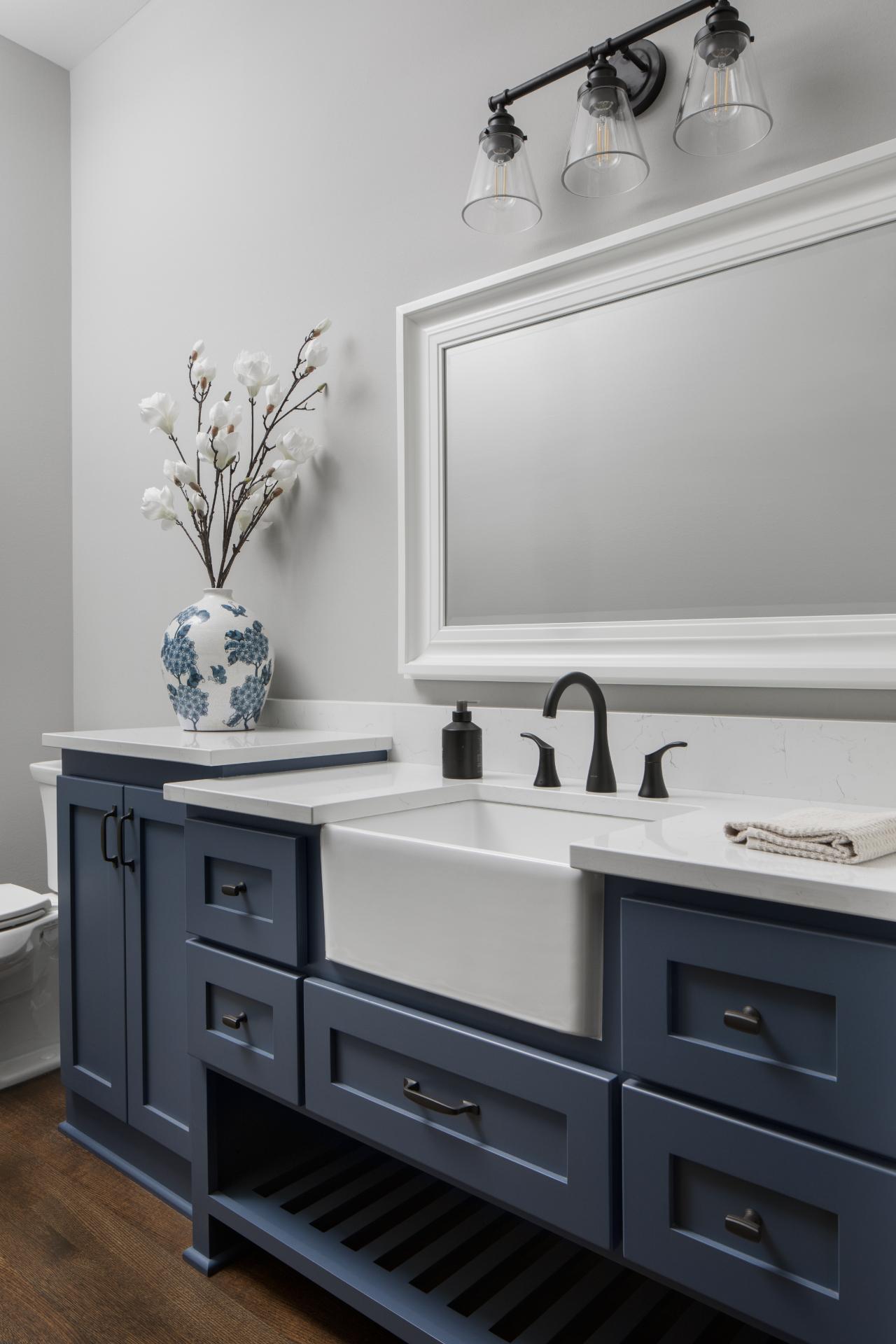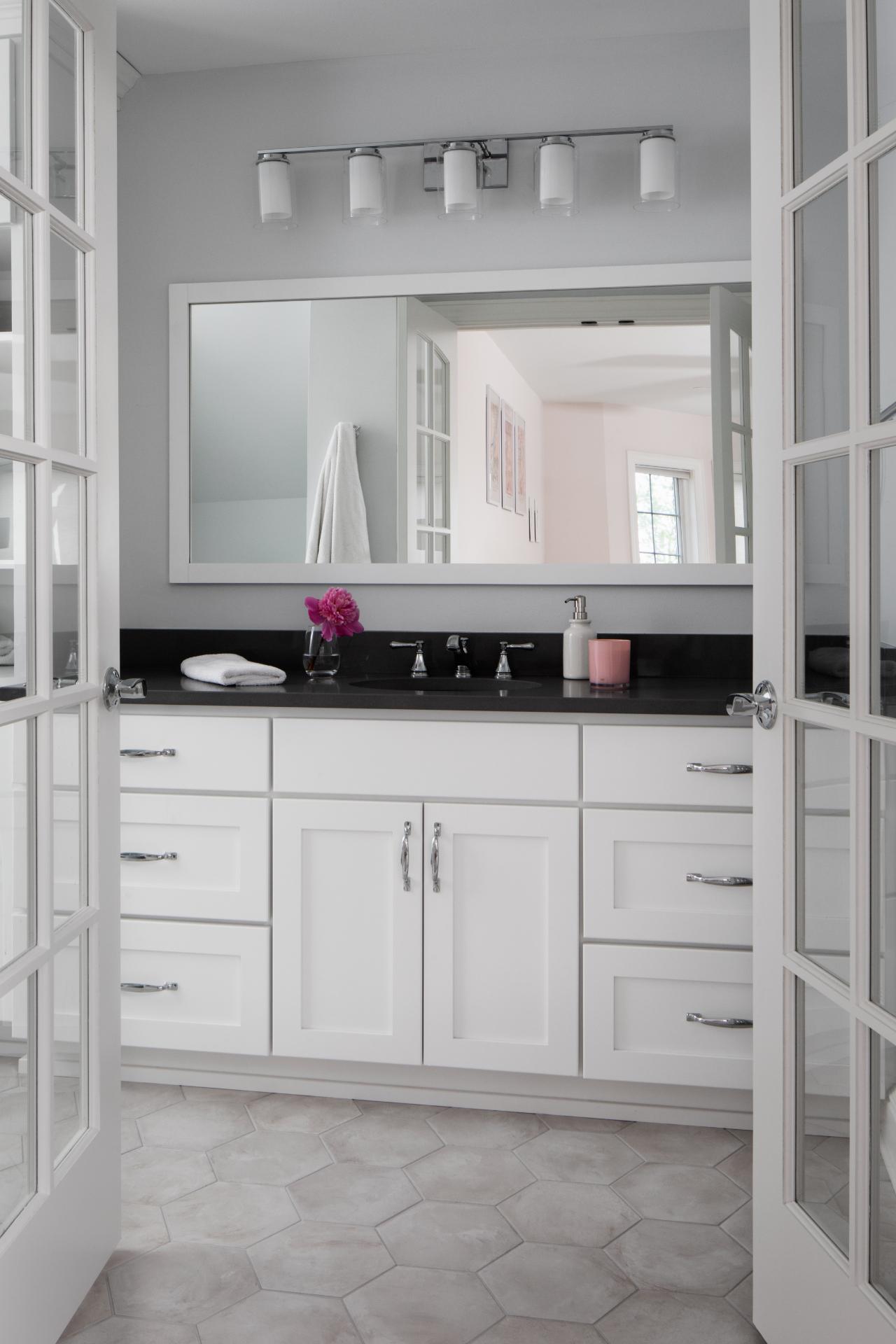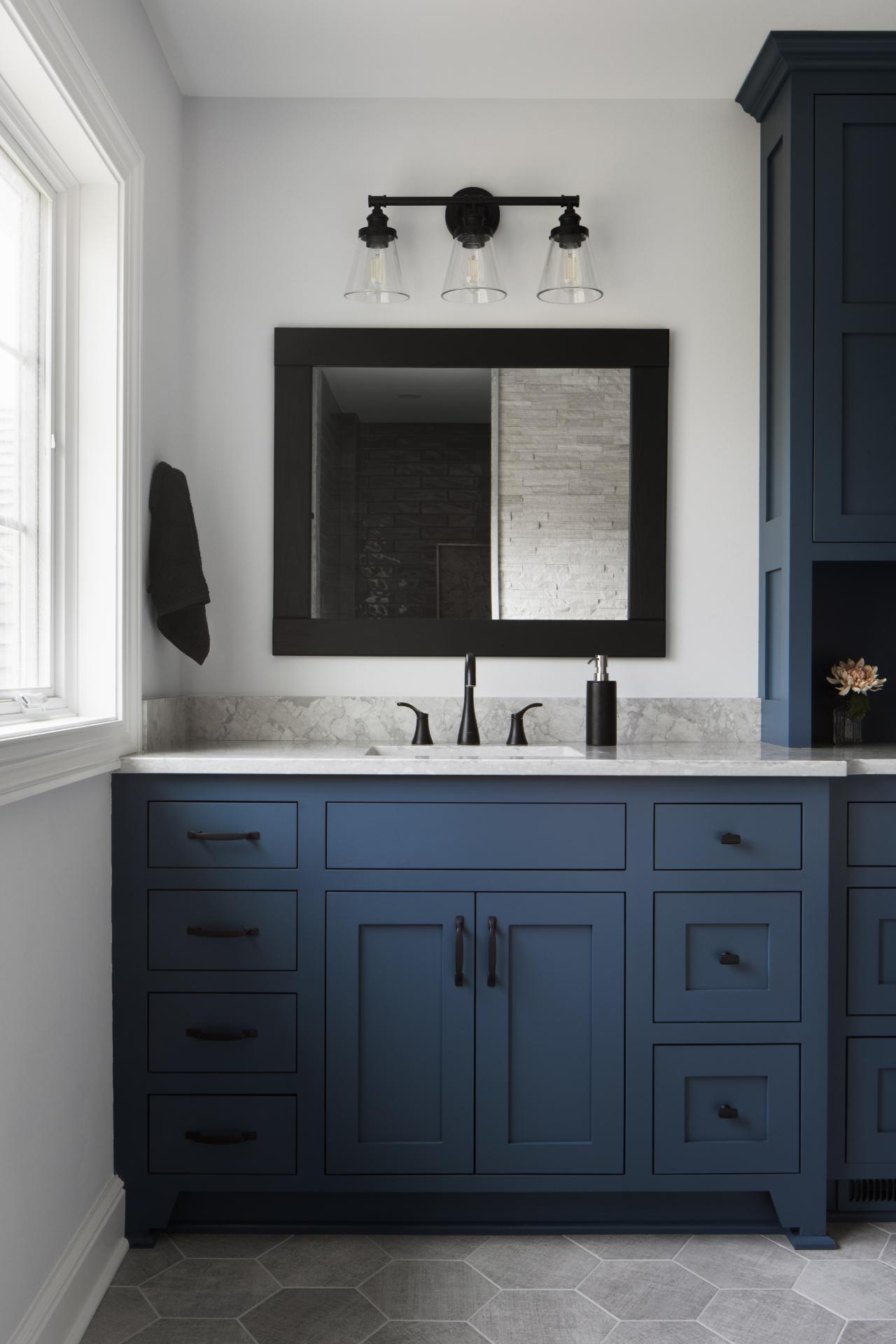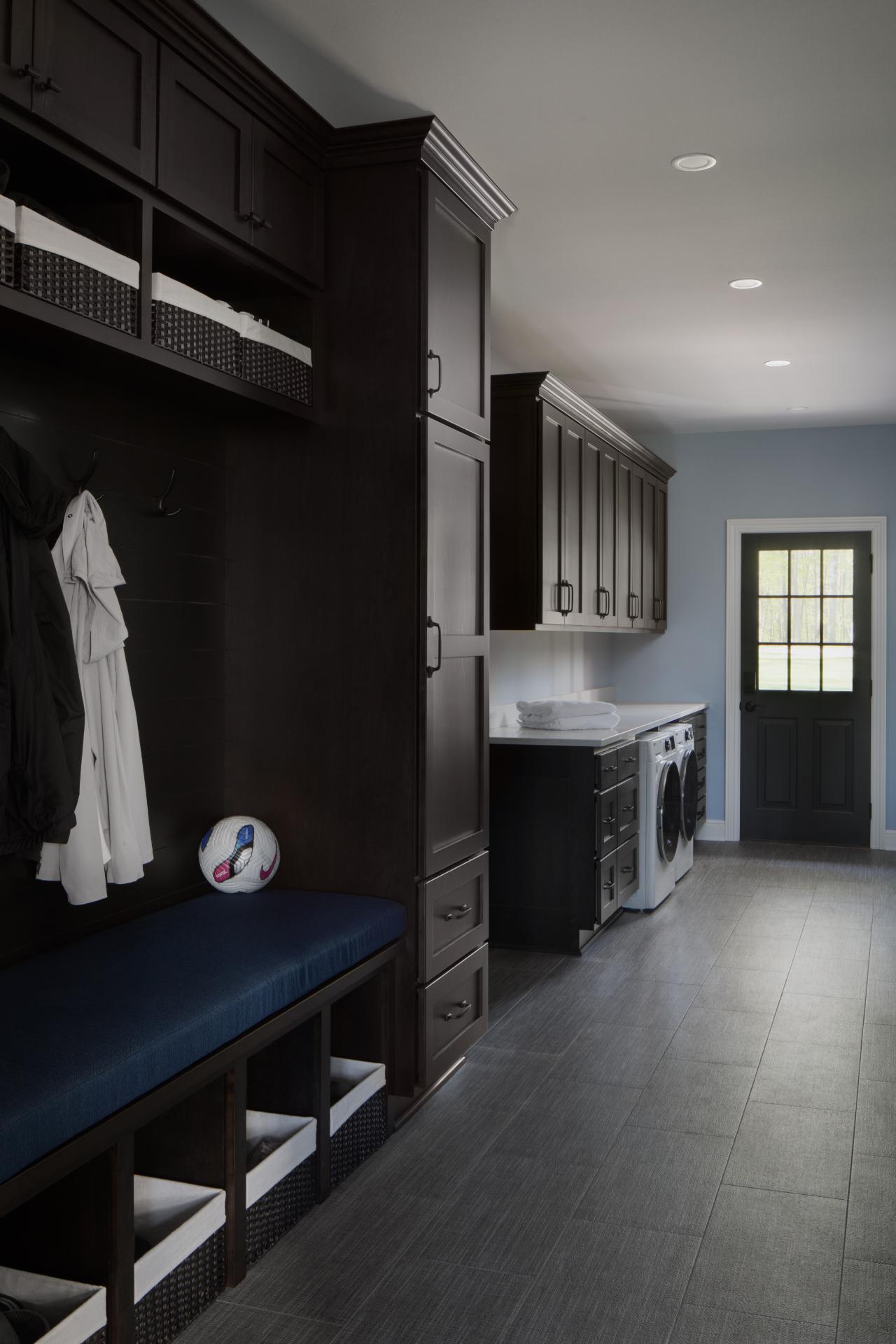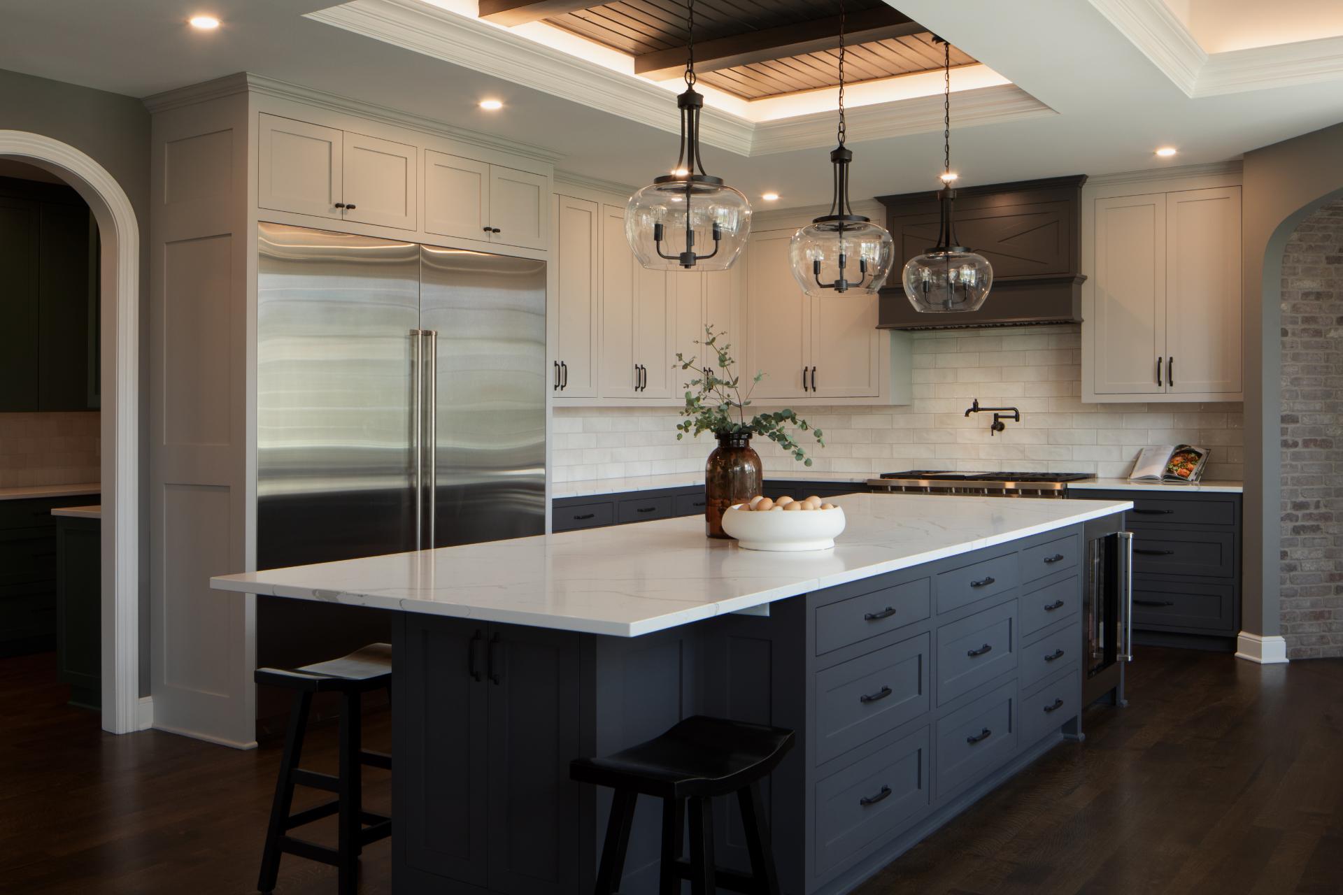 We reworked nearly every inch of this first floor to turn a dated layout into a warm, functional space for family living and entertaining. In the kitchen, coffered ceilings, arched openings, and layered finishes create a sense of timeless character, while natural light and custom cabinetry keep things fresh and inviting. The new mudroom, butler’s pantry, sunroom, powder room, and living room were all thoughtfully updated to feel cohesive yet distinct, with details like brick accents, bold cabinetry, and modern lighting pulling everything together.